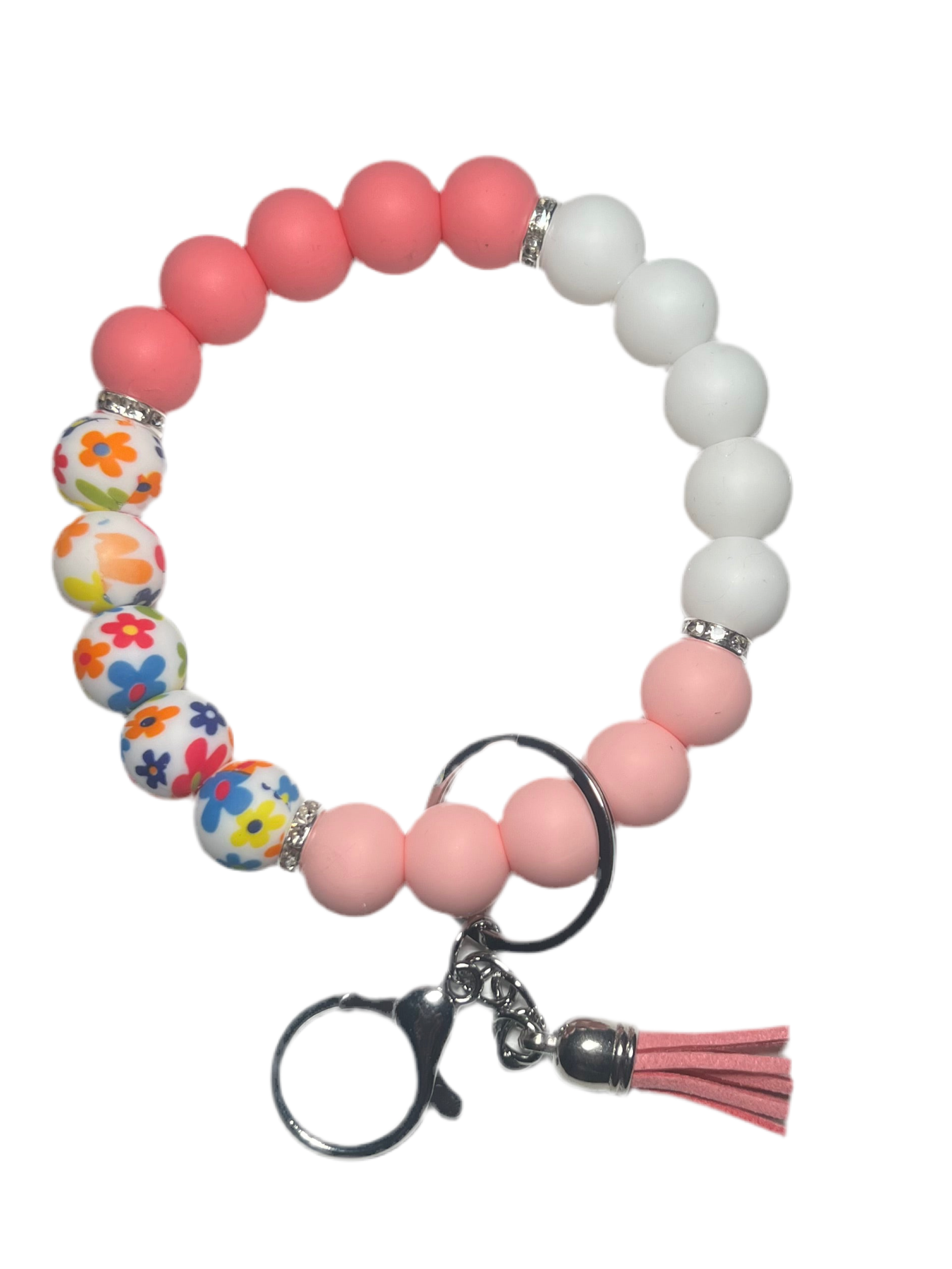 Floral Silicone Beaded Wristlet Keychain – Pink & White